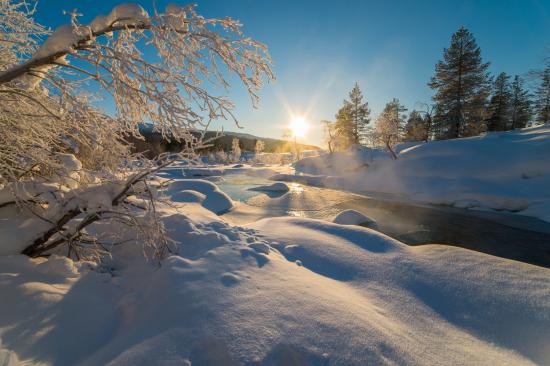 Wallpaper Coast with snow-covered trees by the river under the bright winter sun