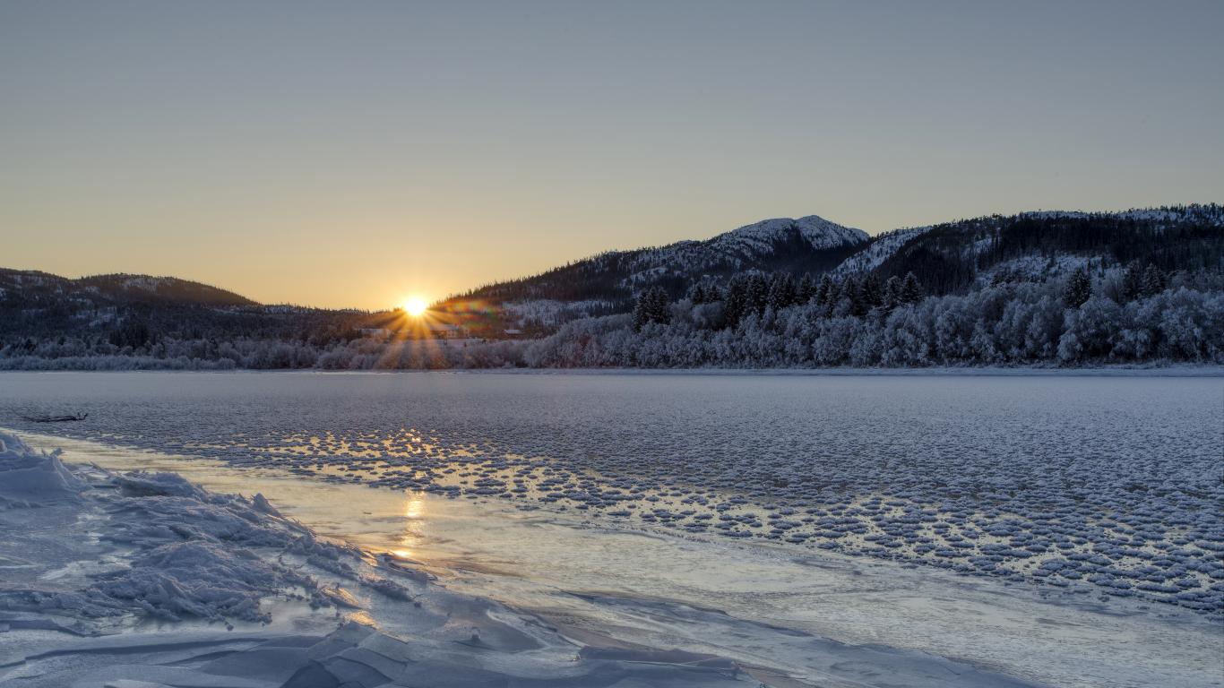Wallpaper Ice-covered river at a snowy forest at sunrise