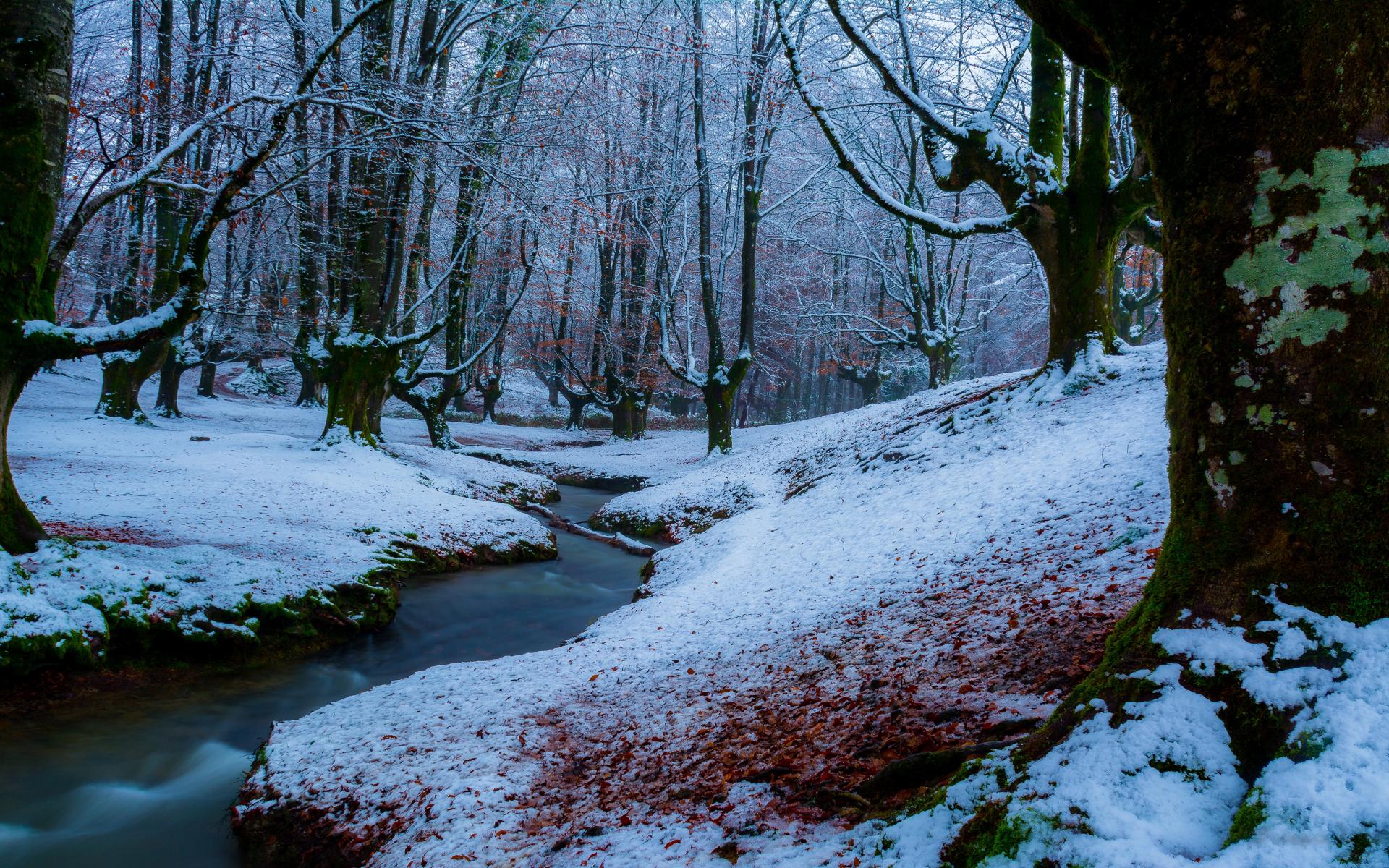 Wallpaper Snow on the fallen leaves at the stream in the empty forest