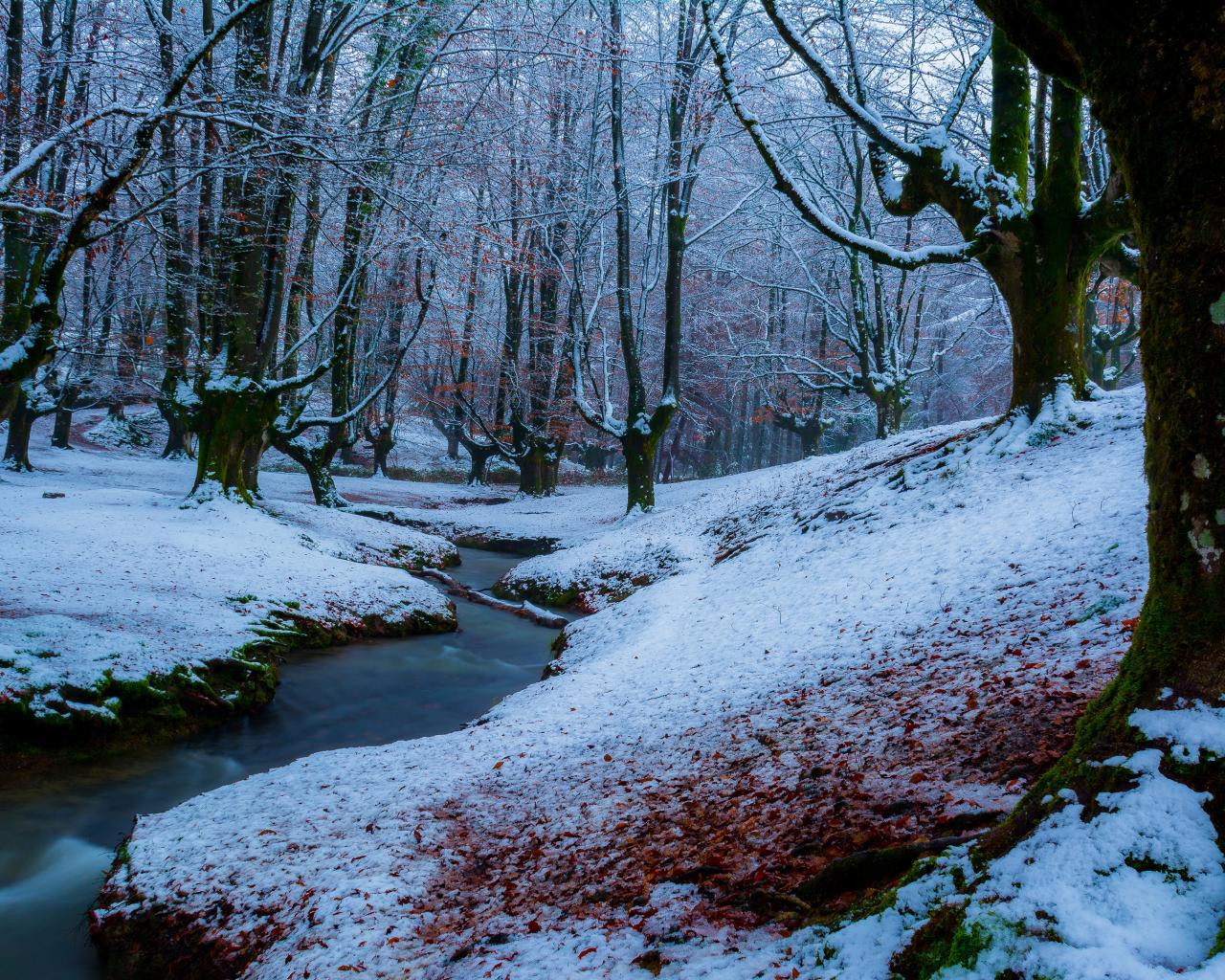 Wallpaper Snow on the fallen leaves at the stream in the empty forest