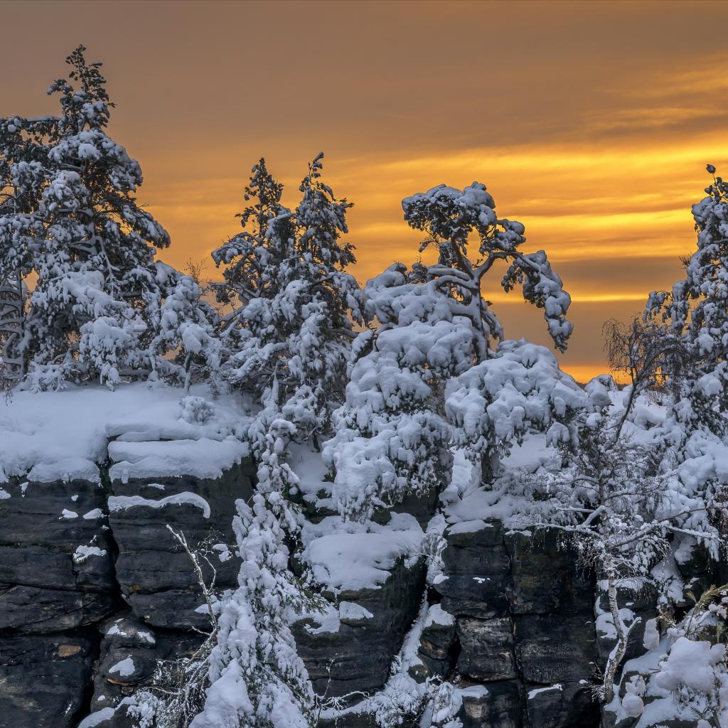 Wallpaper Snow-covered spruce on the tops of the rocks at sunset