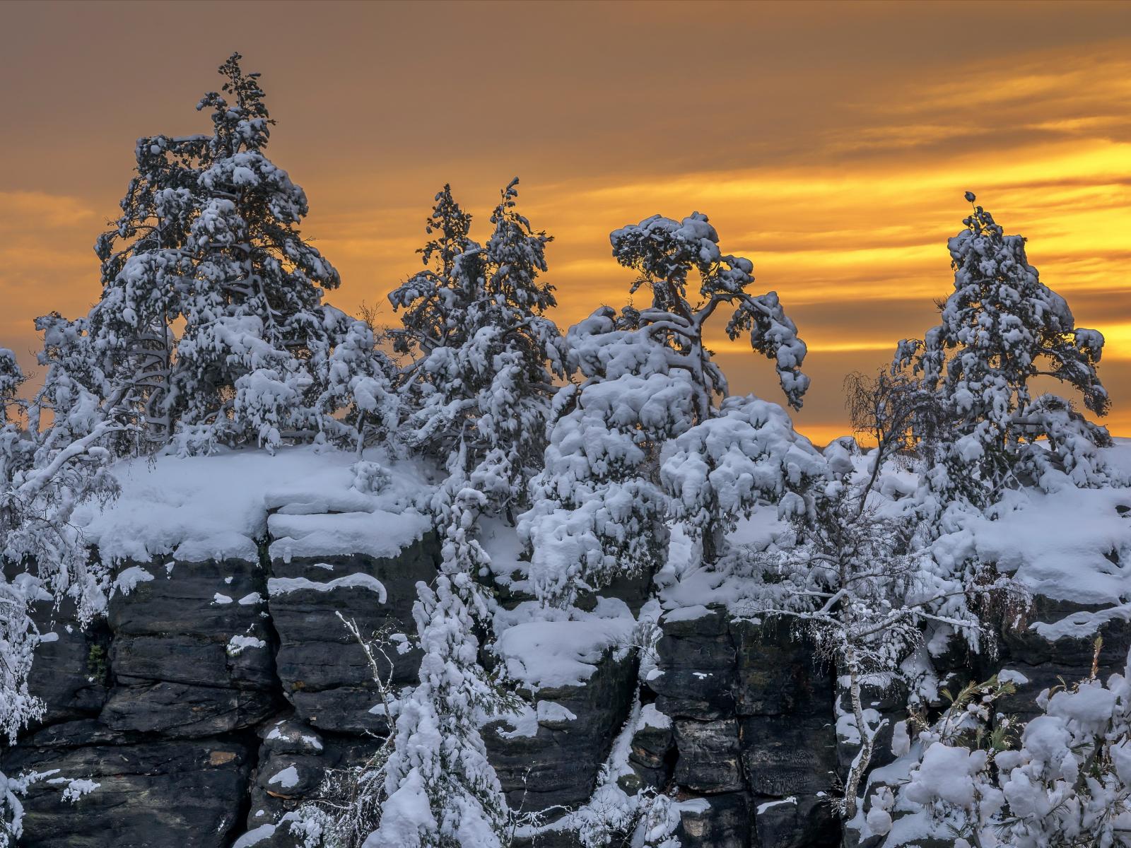 Wallpaper Snow-covered spruce on the tops of the rocks at sunset