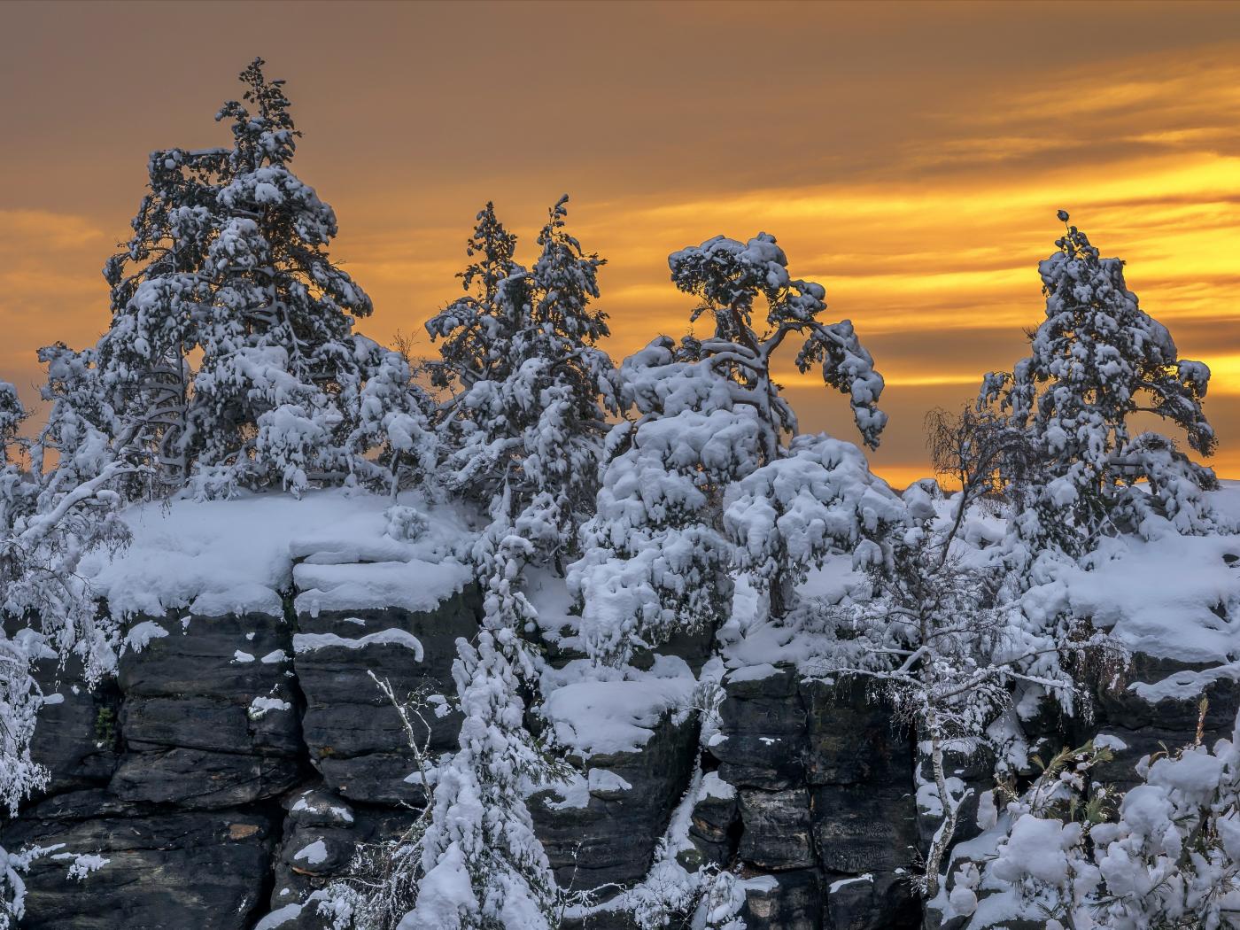 Wallpaper Snow-covered spruce on the tops of the rocks at sunset