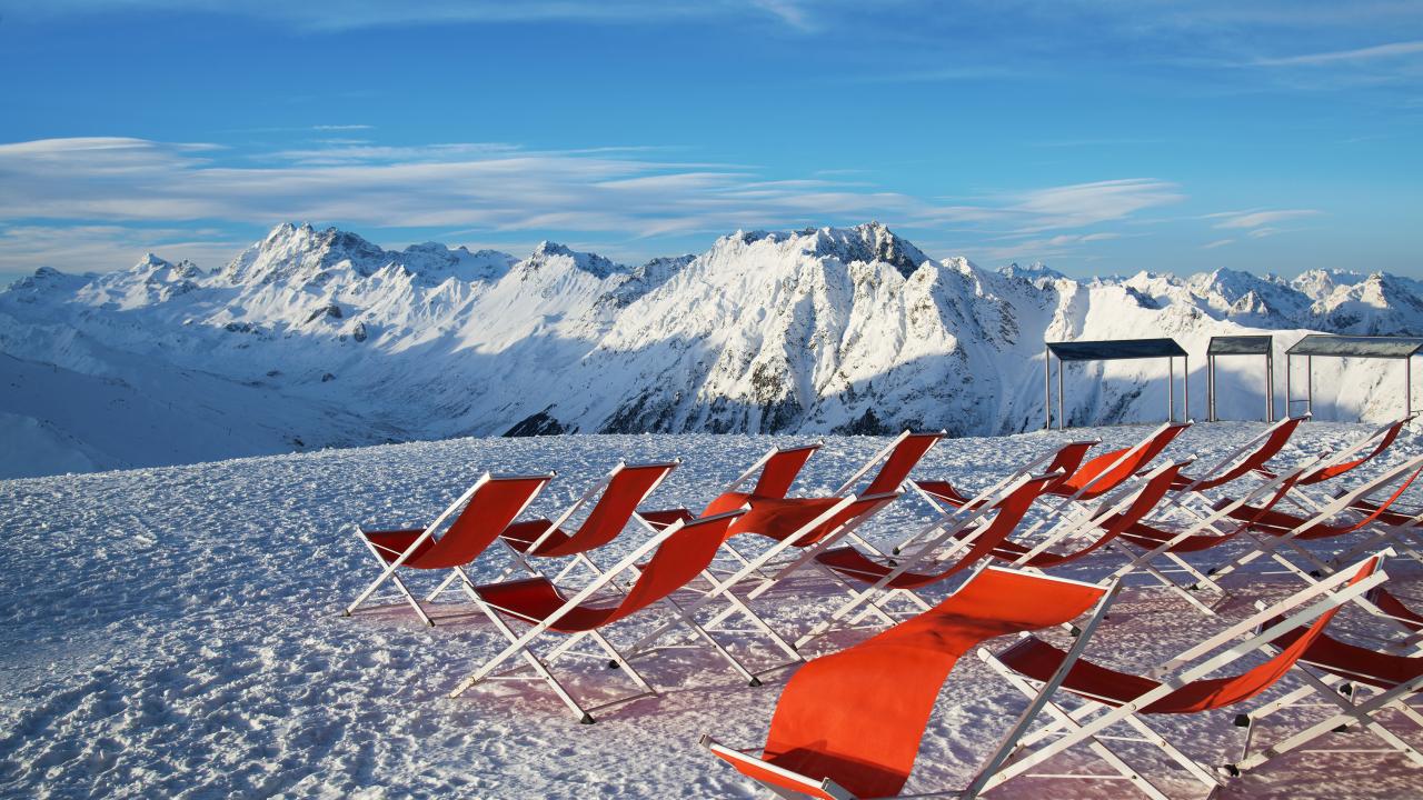 Wallpaper Red sun loungers in the snow in the mountains, Austria