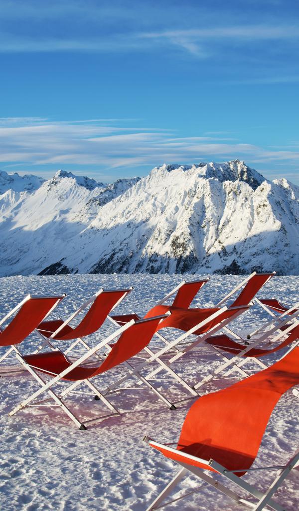 Wallpaper Red sun loungers in the snow in the mountains, Austria