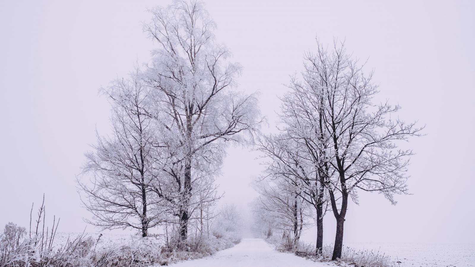 Wallpaper White trees by a snowy road in winter