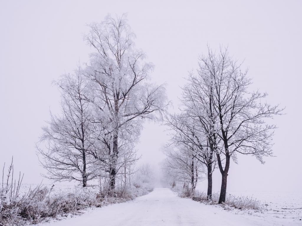 Wallpaper White trees by a snowy road in winter