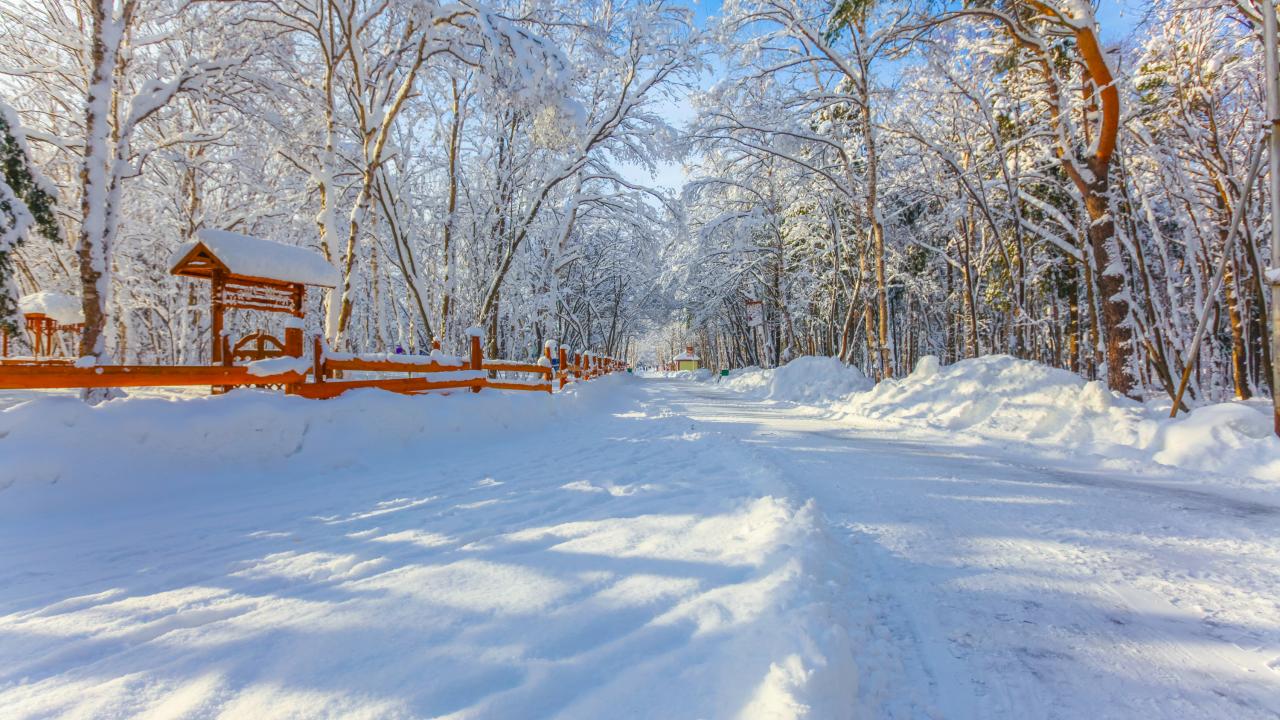 Wallpaper Beautiful white snow-covered trees by a snowy road in winter