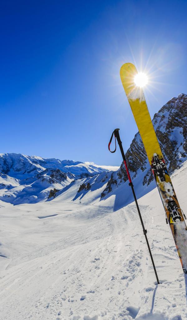 Wallpaper Skis with sticks in the snowy mountains in the sun