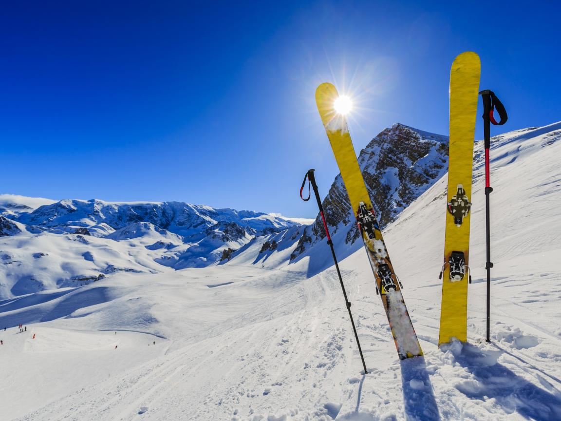 Wallpaper Skis with sticks in the snowy mountains in the sun