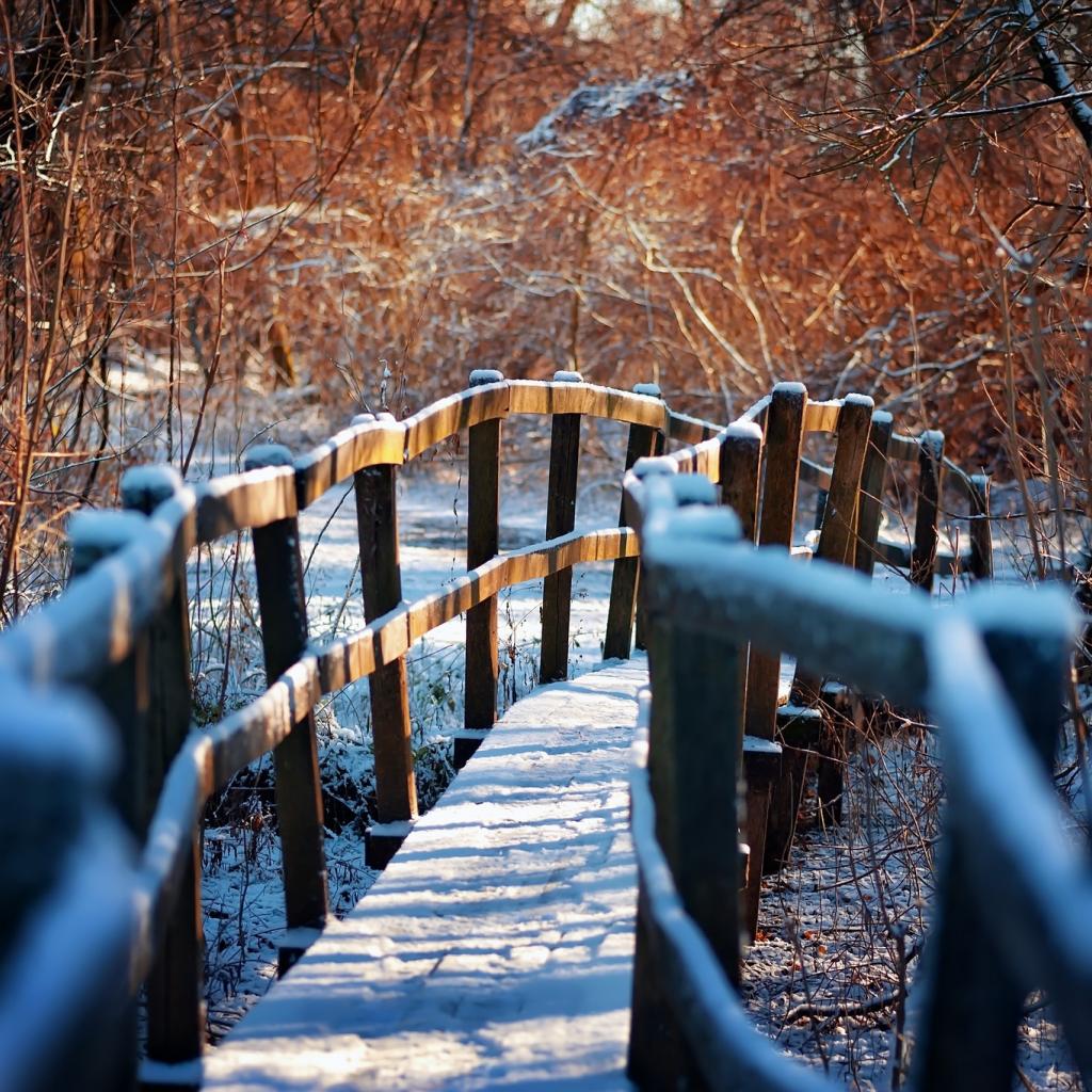 Wallpaper Snow Covered Wooden Bridge in the Forest