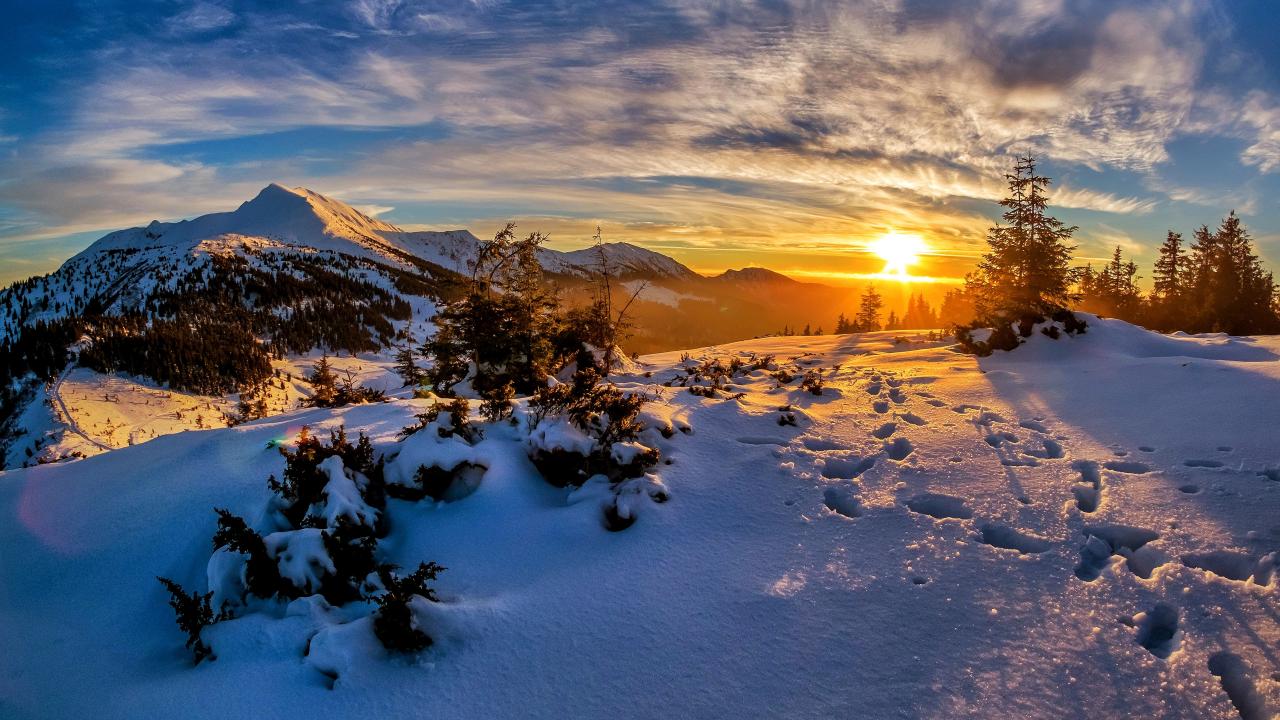 Wallpaper Footprints in the snow on a mountain at dawn in winter