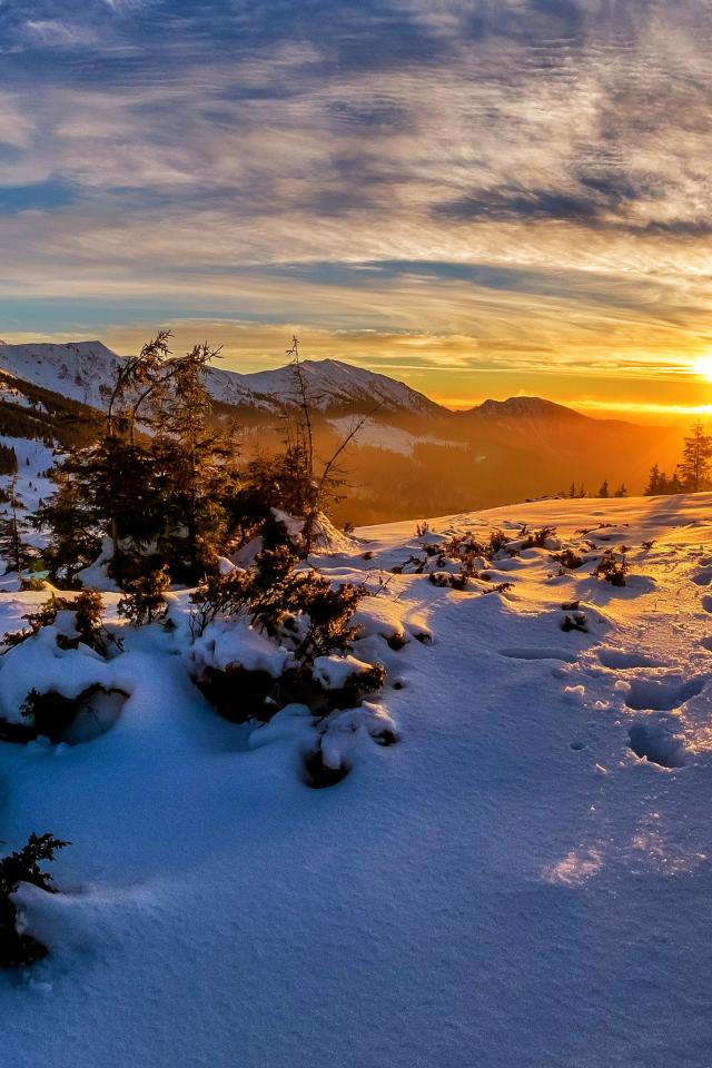 Wallpaper Footprints in the snow on a mountain at dawn in winter