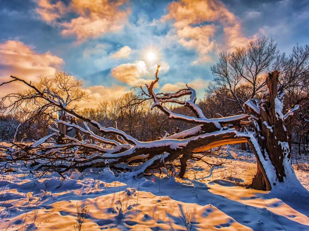 Wallpaper Fallen tree in a snowy forest in the sun
