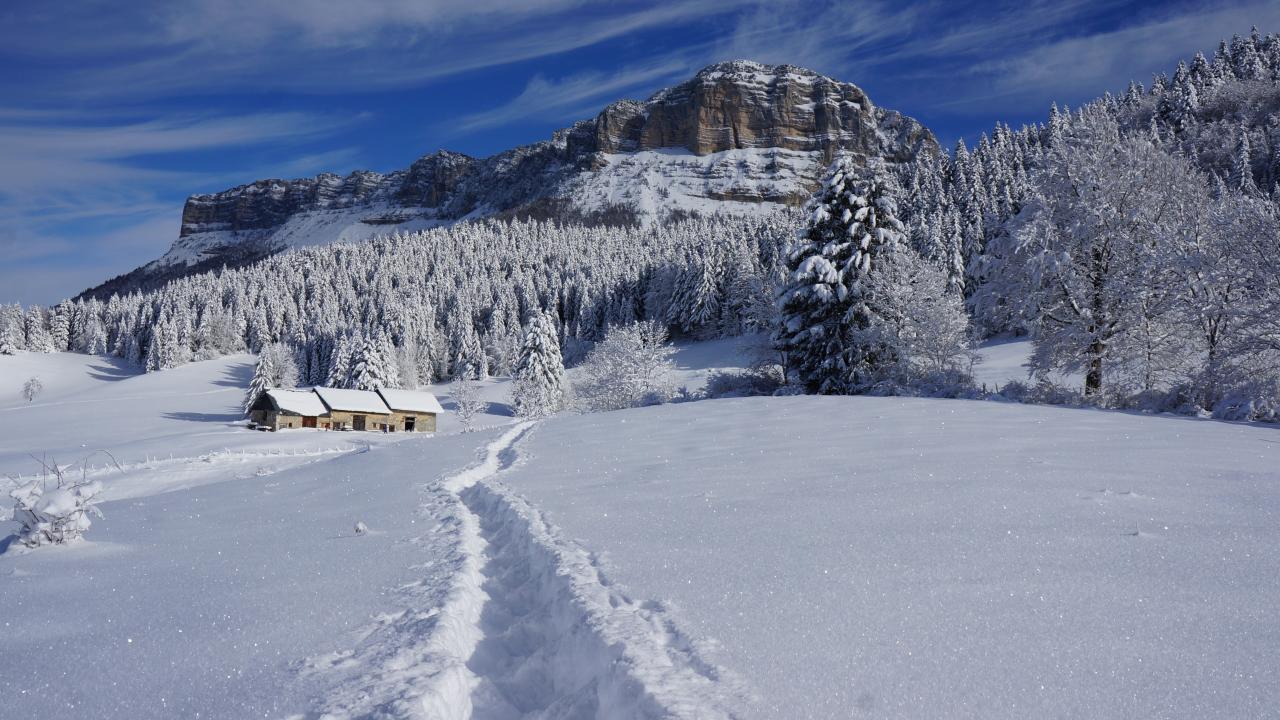 Wallpaper A path in the snow leads to a mountain under a blue sky