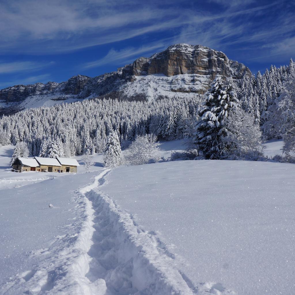 Wallpaper A path in the snow leads to a mountain under a blue sky