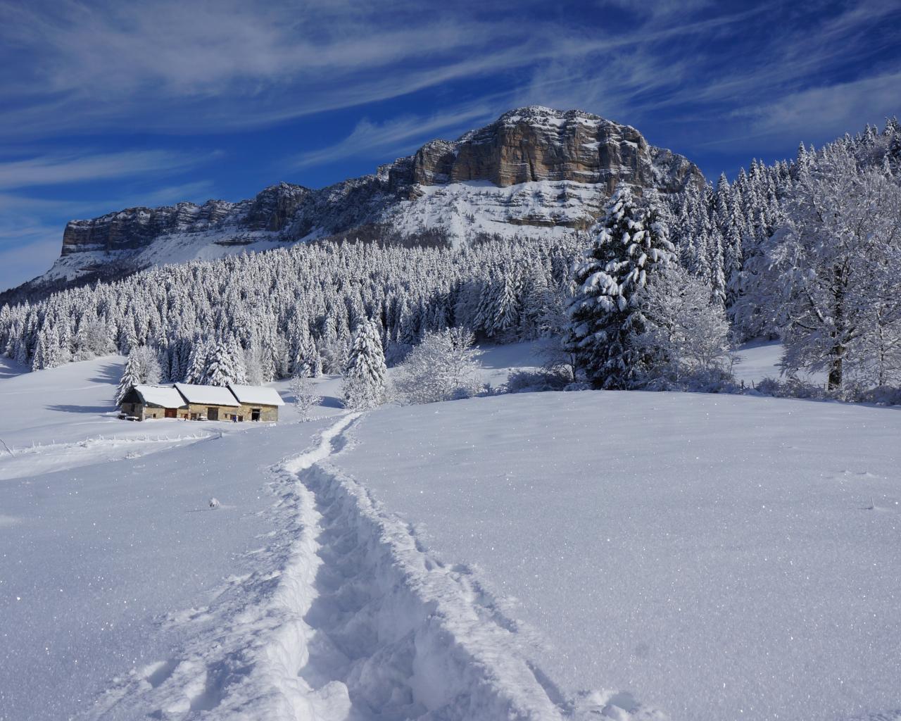Wallpaper A path in the snow leads to a mountain under a blue sky