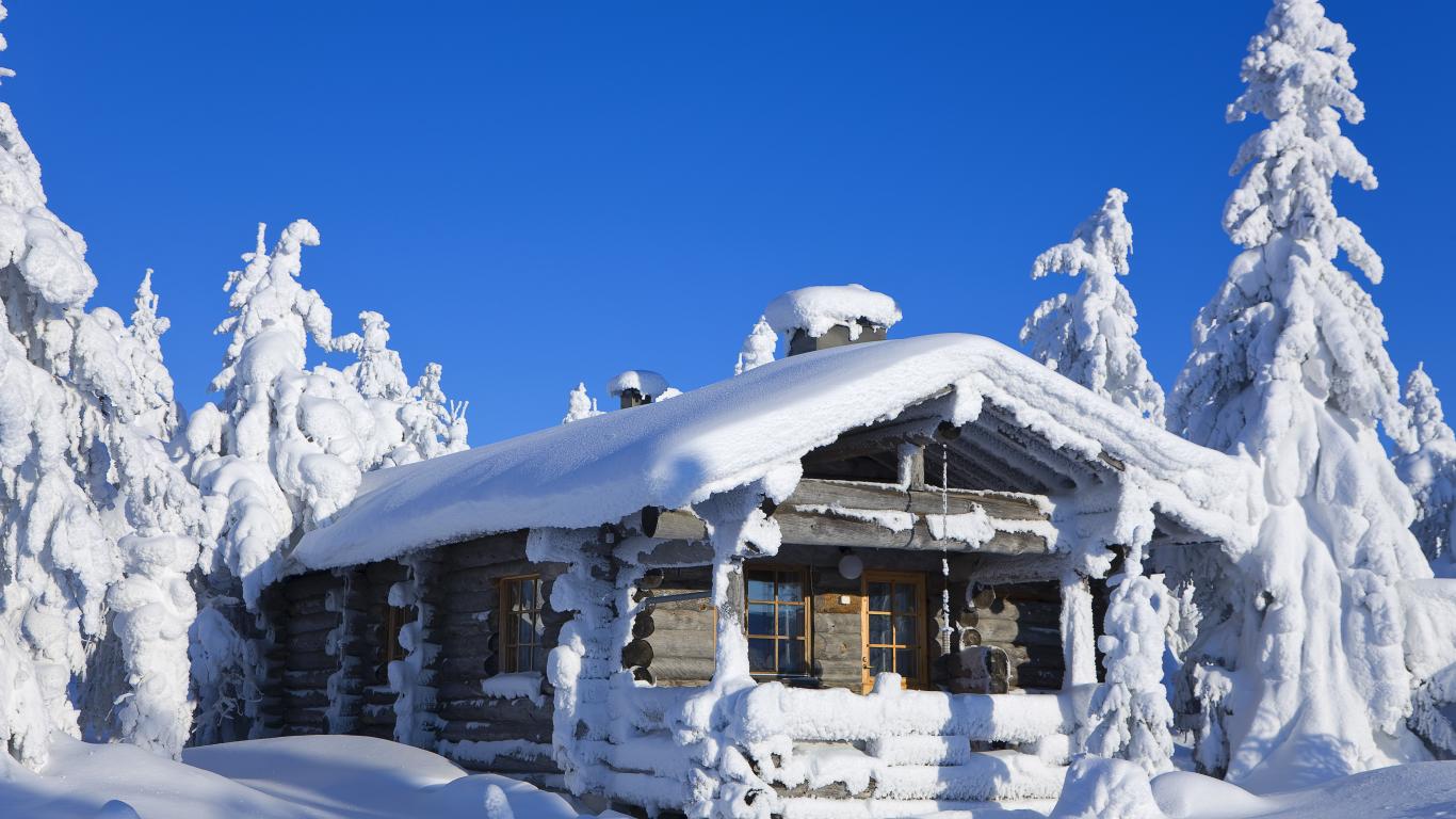 Wallpaper Snow covered house in a coniferous forest under a blue sky