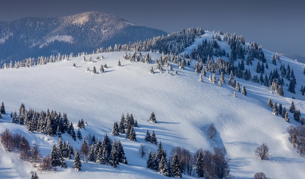 Wallpaper Beautiful view of snowy mountains with fir trees