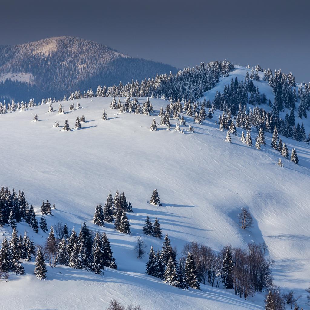 Wallpaper Beautiful view of snowy mountains with fir trees