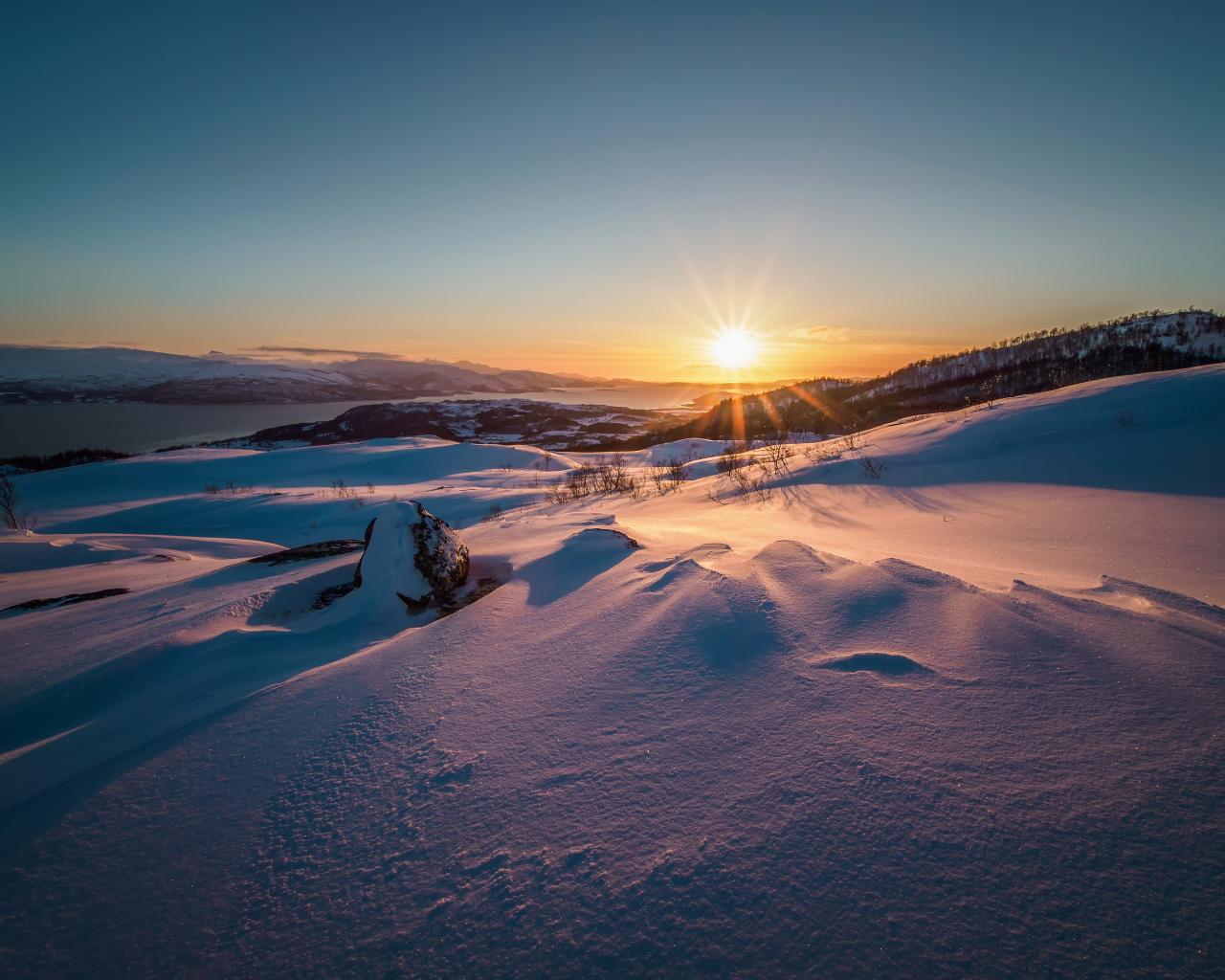 Wallpaper Sunrise over the snowy hills