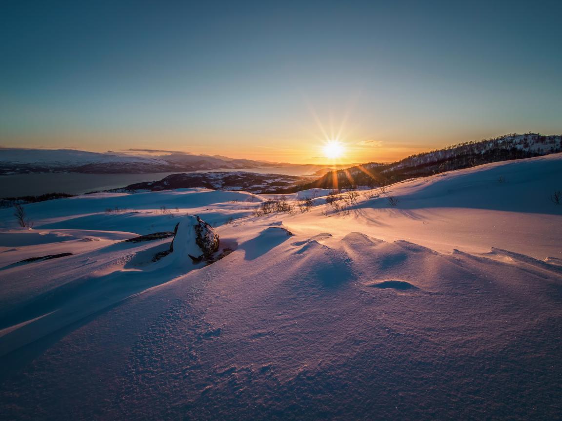 Wallpaper Sunrise over the snowy hills