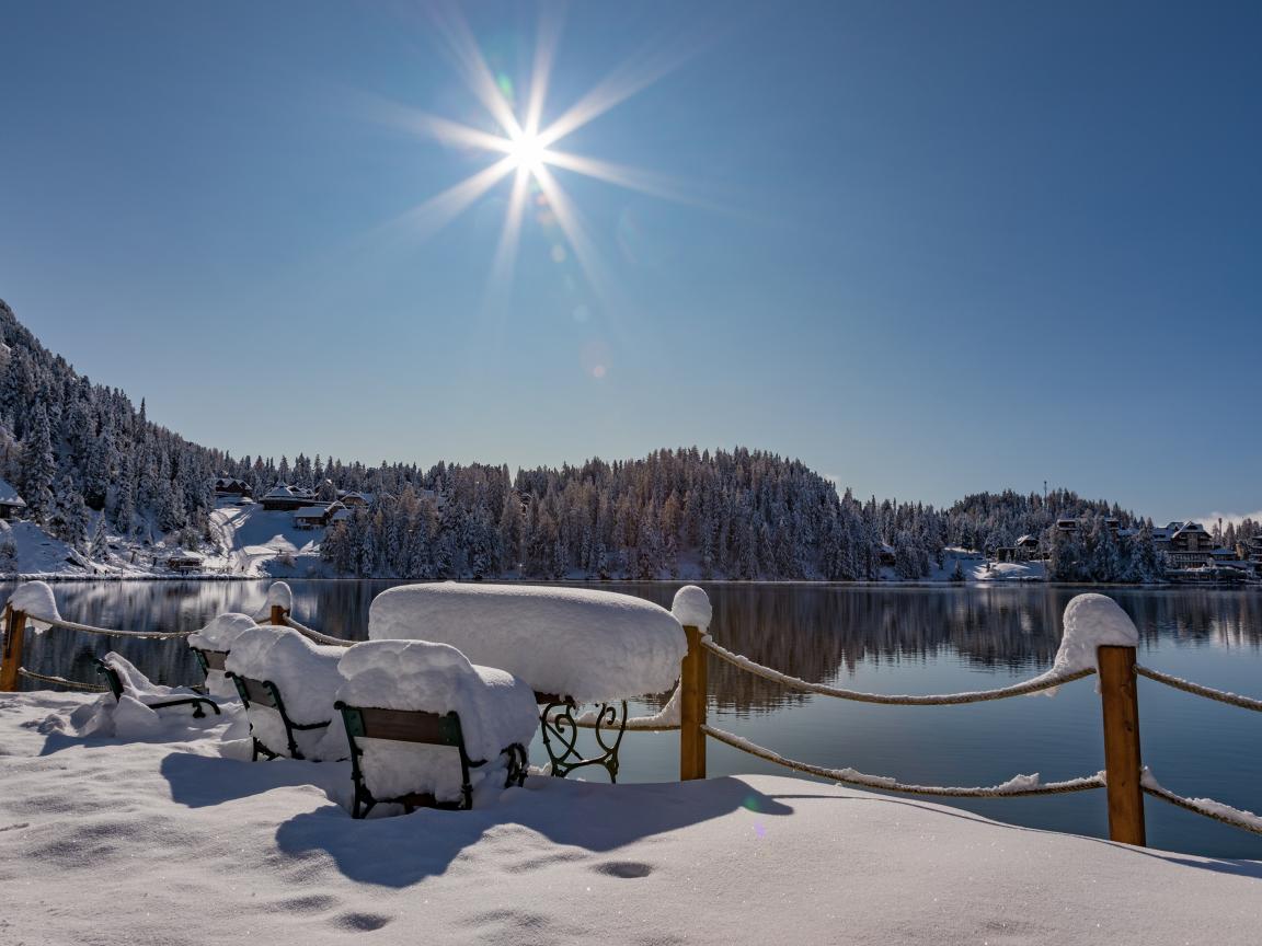 Wallpaper Bright winter sun over a lake with snowy shores