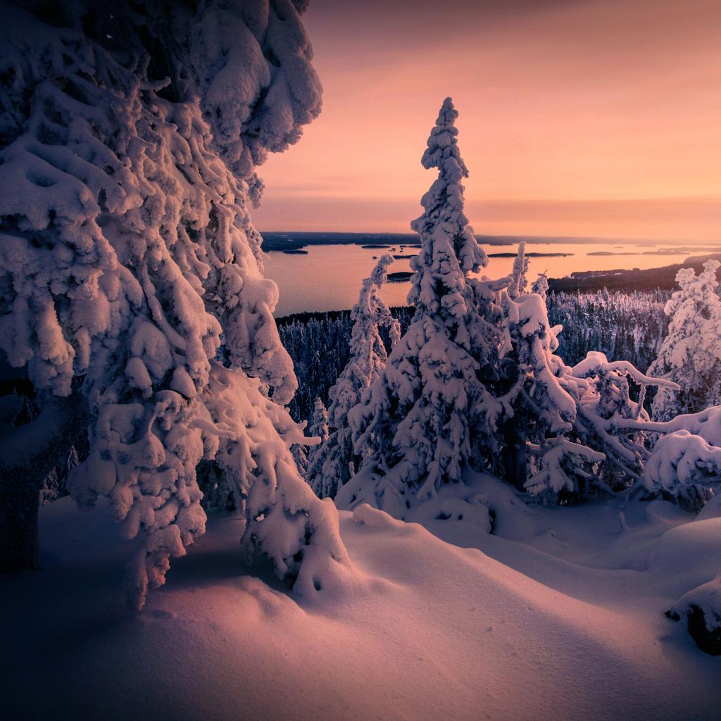 Wallpaper Snowy spruce trees in the winter forest against the sky at sunset