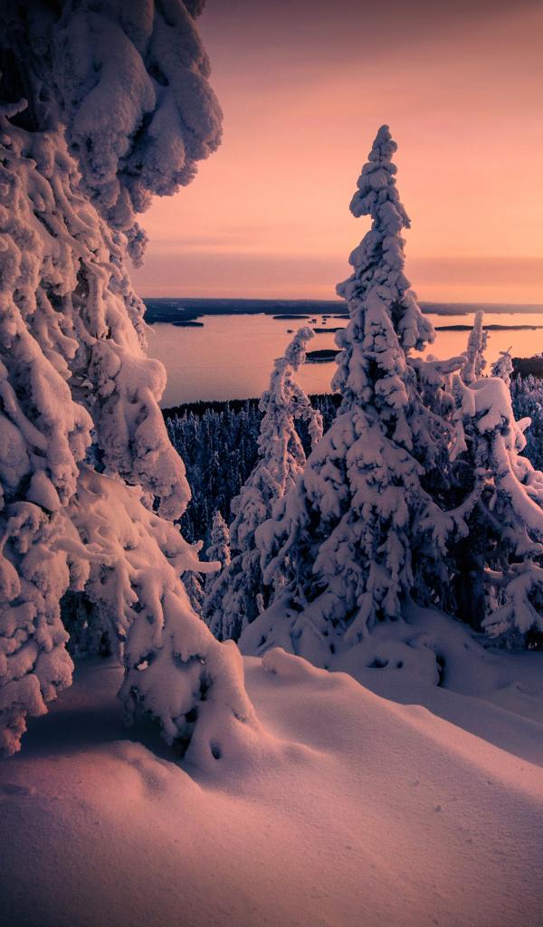 Wallpaper Snowy spruce trees in the winter forest against the sky at sunset