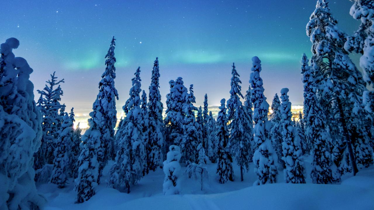 Wallpaper Northern lights in the sky over snowy firs
