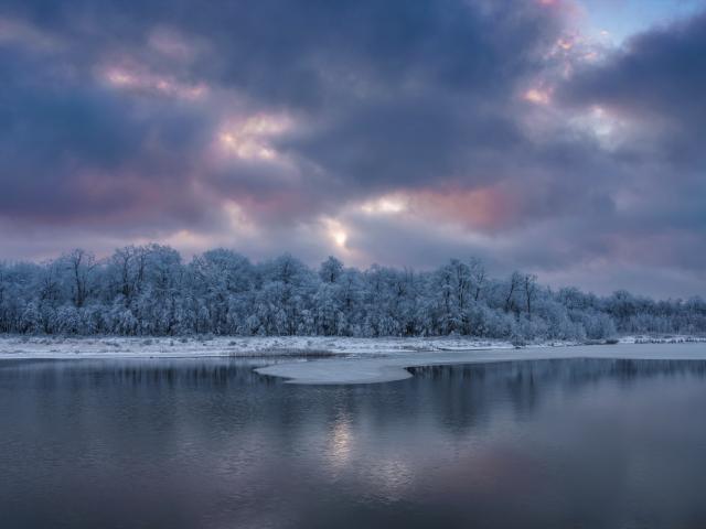 Wallpaper Cold sky with clouds above the snowy trees by the river