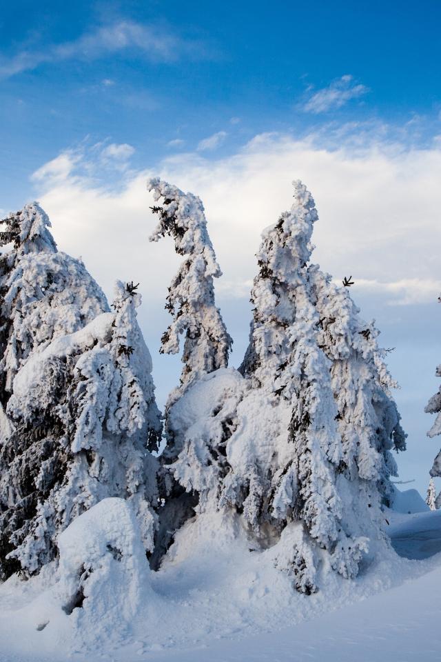 Wallpaper Tall snow-covered fir trees under the blue sky in winter