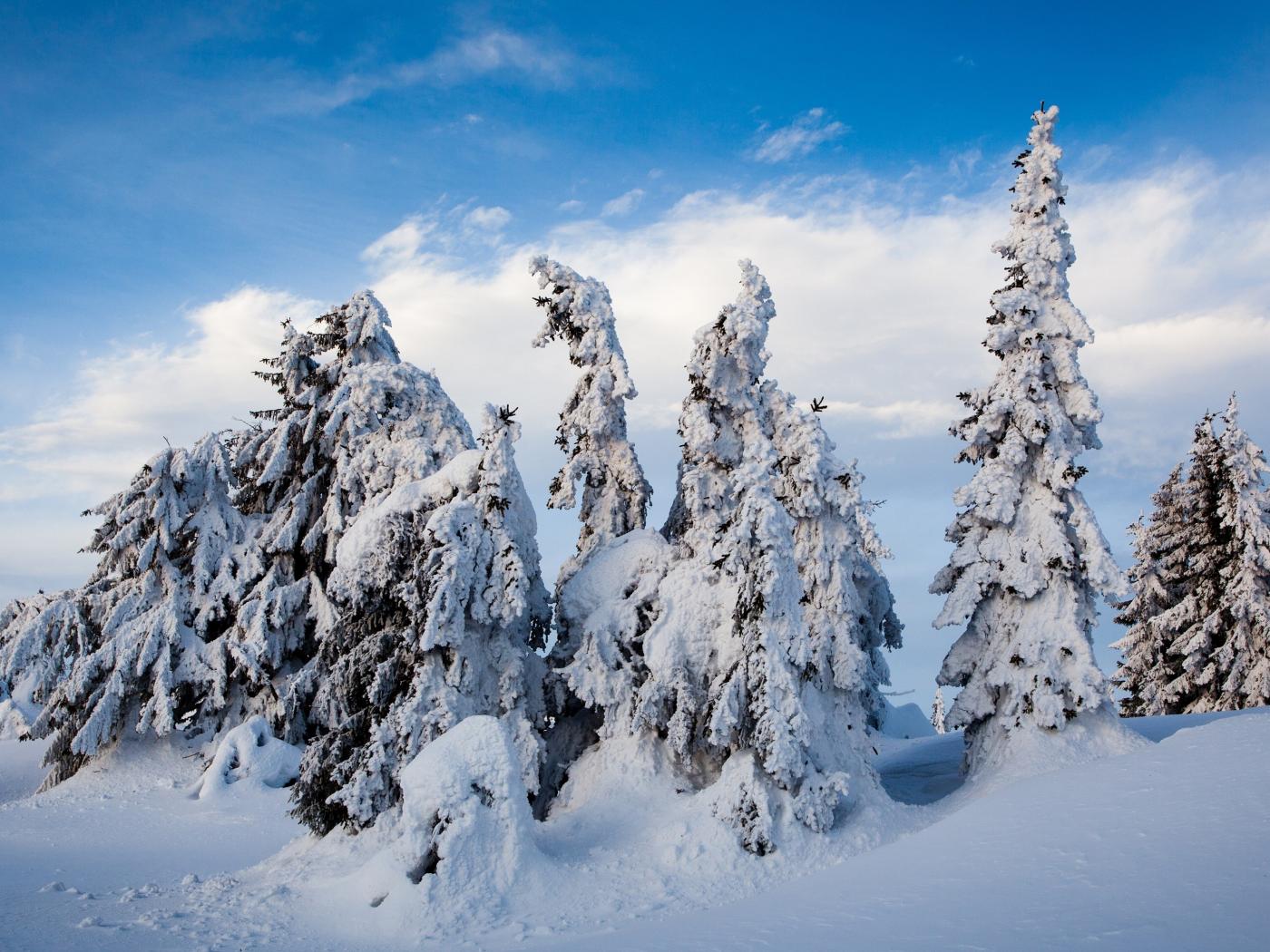 Wallpaper Tall snow-covered fir trees under the blue sky in winter