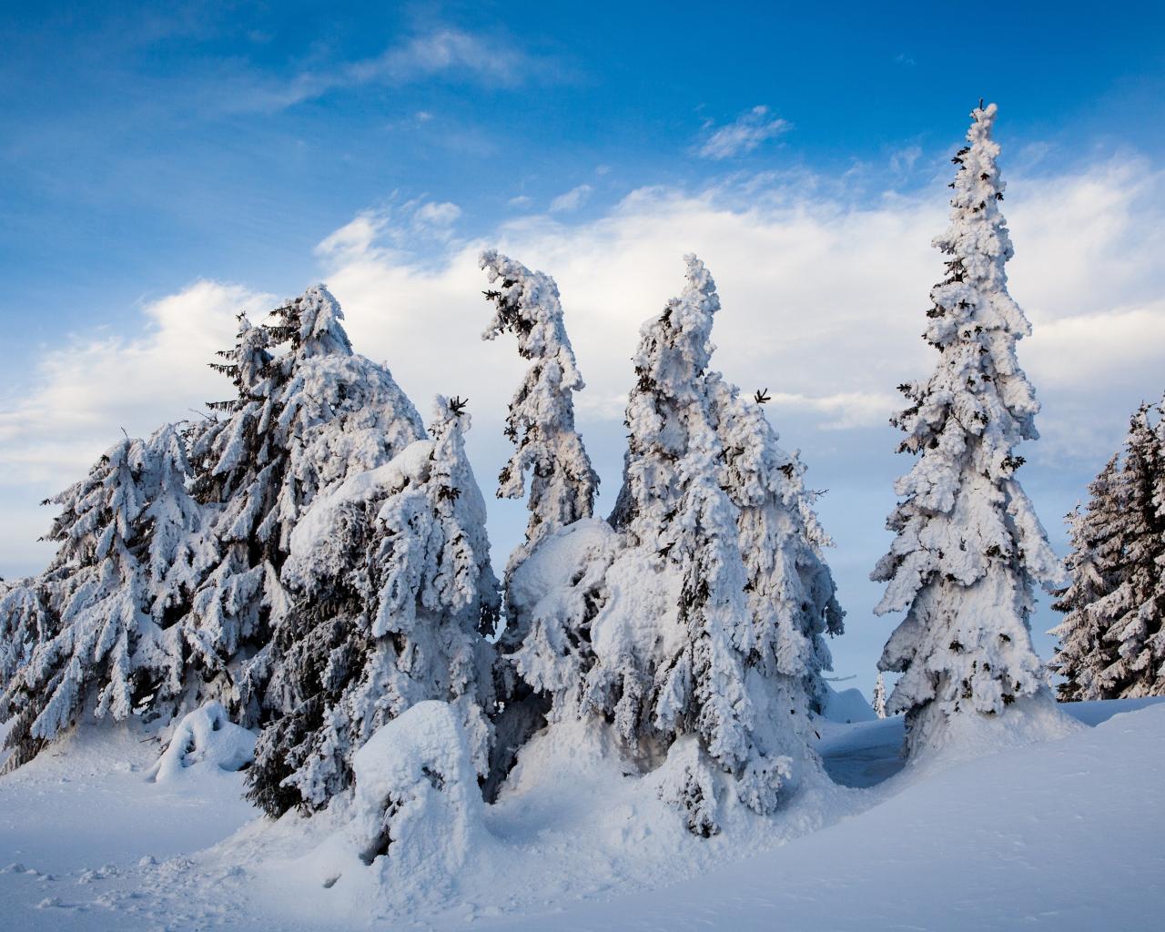 Wallpaper Tall snow-covered fir trees under the blue sky in winter