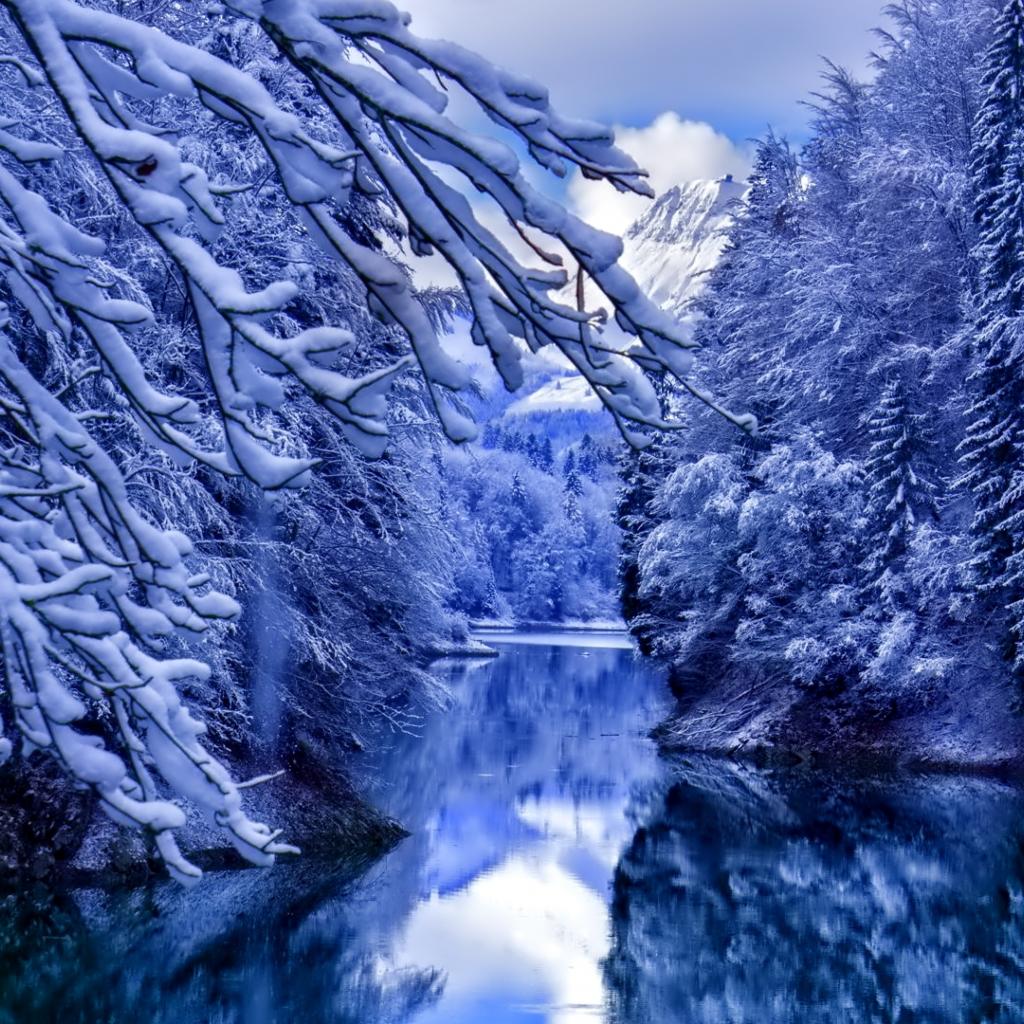 Wallpaper Snow-covered trees by the river in the mountains