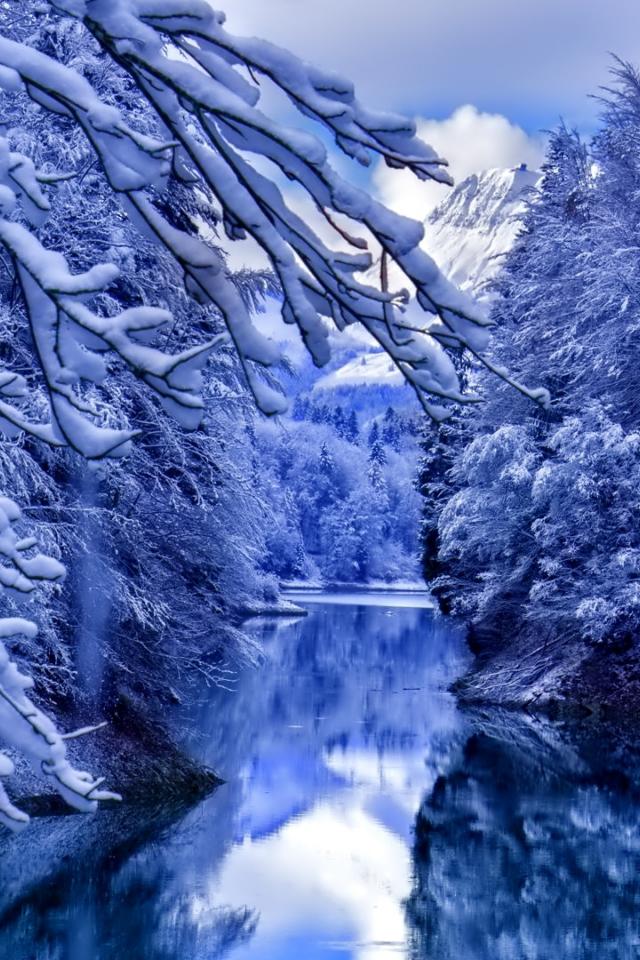 Wallpaper Snow-covered trees by the river in the mountains