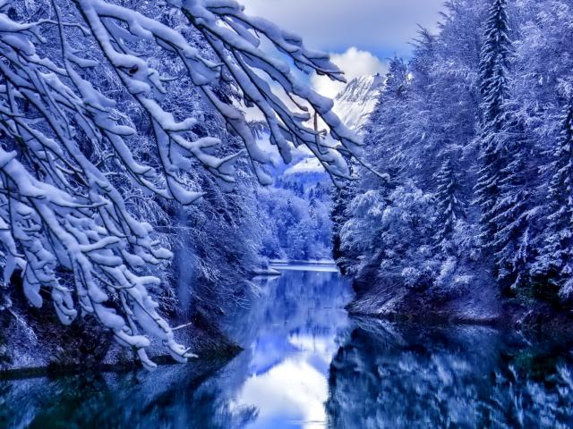 Wallpaper Snow-covered trees by the river in the mountains