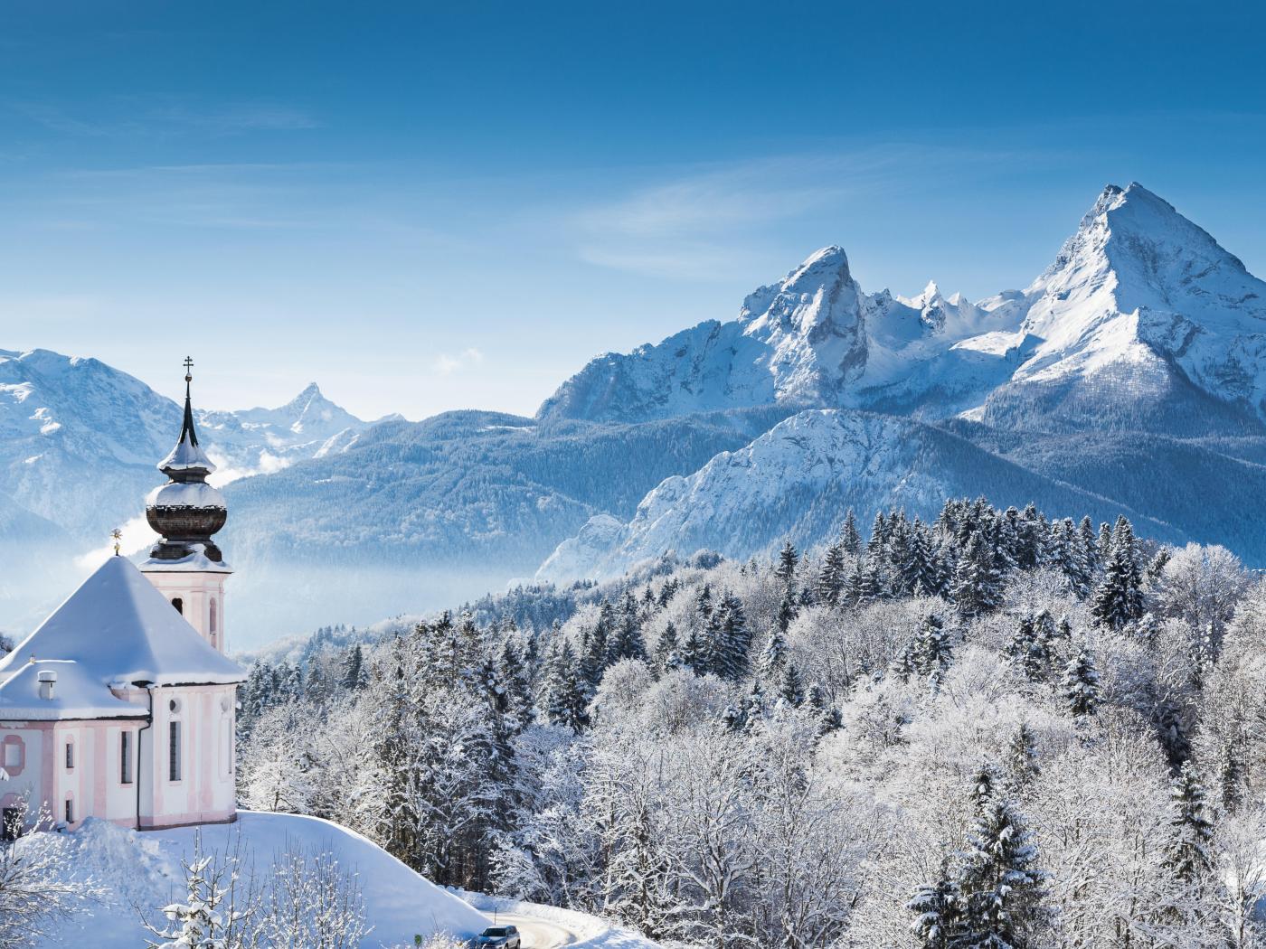Wallpaper Temple by the forest against the background of snow-capped mountains