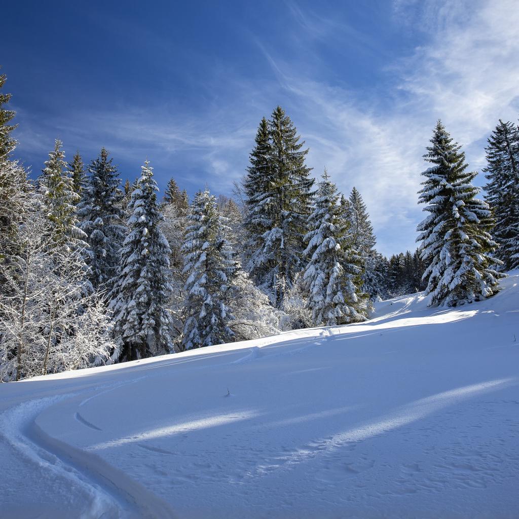 Wallpaper Tall green snow-covered fir trees in the forest under the blue sky