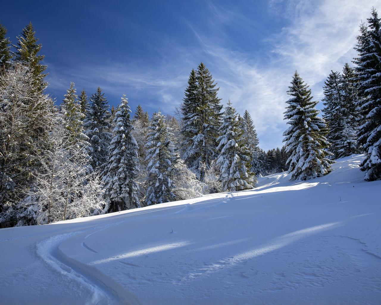 Wallpaper Tall green snow-covered fir trees in the forest under the blue sky