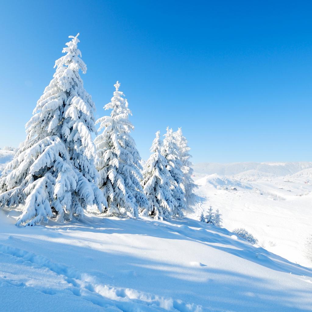 Wallpaper Snow covered fir trees on the hill under the blue sky