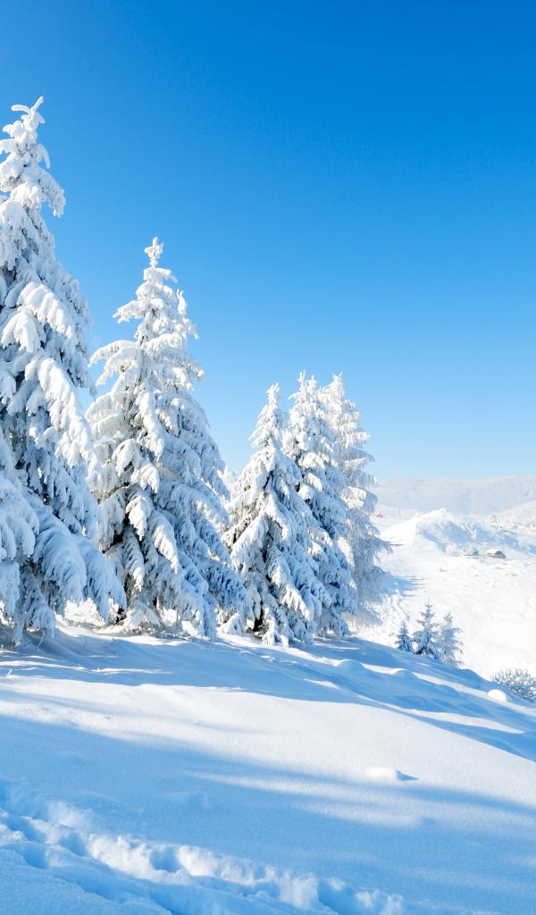 Wallpaper Snow covered fir trees on the hill under the blue sky