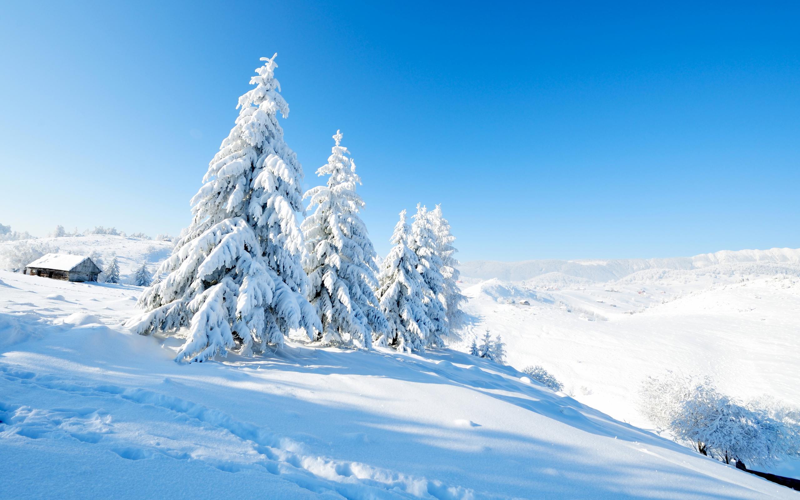 Wallpaper Snow covered fir trees on the hill under the blue sky