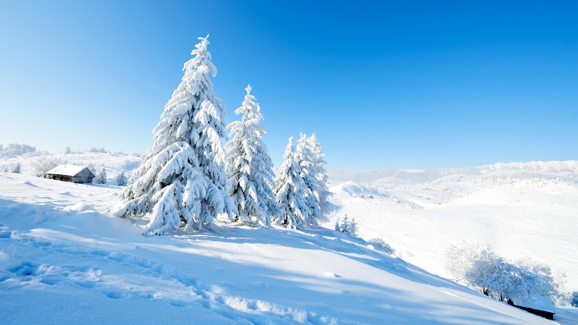Wallpaper Snow covered fir trees on the hill under the blue sky