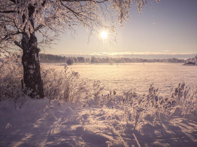 Wallpaper Snow-covered cold lake in the sun in winter
