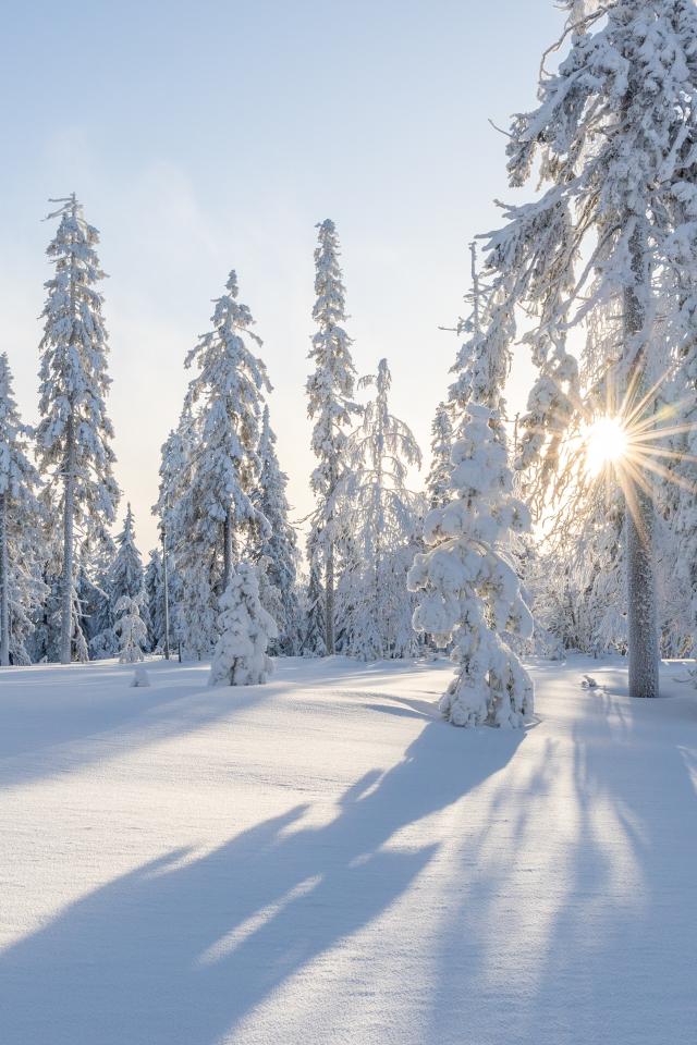 Wallpaper Tall snow-covered fir trees in the sun in the winter forest