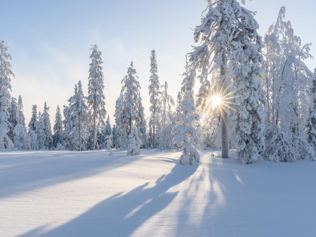 Wallpaper Tall snow-covered fir trees in the sun in the winter forest