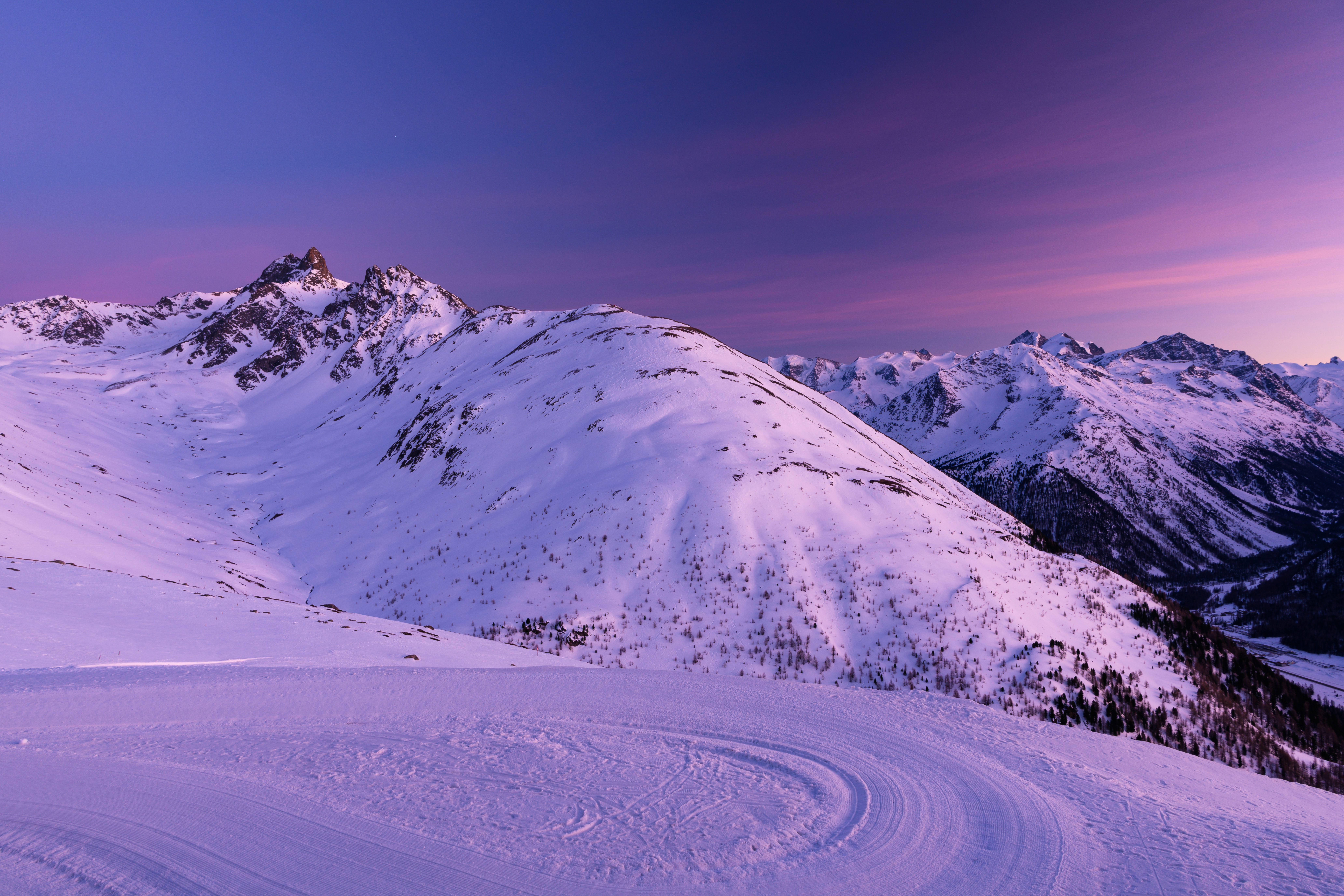 Wallpaper Snow capped mountains under a beautiful purple sky