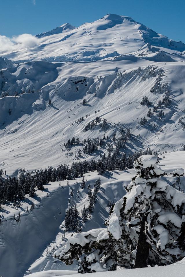 Wallpaper Snow-capped mountain slopes in the rays of the sun under the blue sky