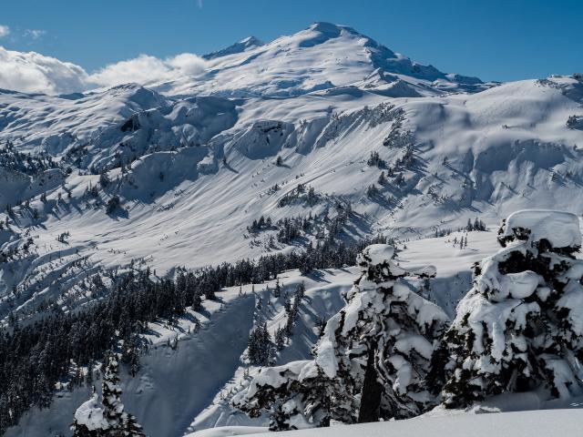 Wallpaper Snow-capped mountain slopes in the rays of the sun under the blue sky